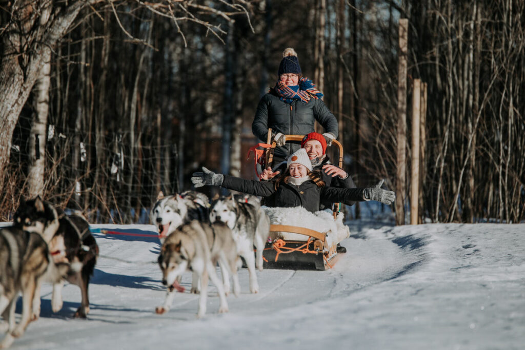 The husky sleds are designed for 1–2 people, with one person driving and the other riding as a passenger. You can choose between a 2 km or 5 km sled ride, gliding through beautiful snowy forest landscapes. After returning to the farm, relax and warm up with hot berry juice, tea, or coffee, served with traditional cookies.
