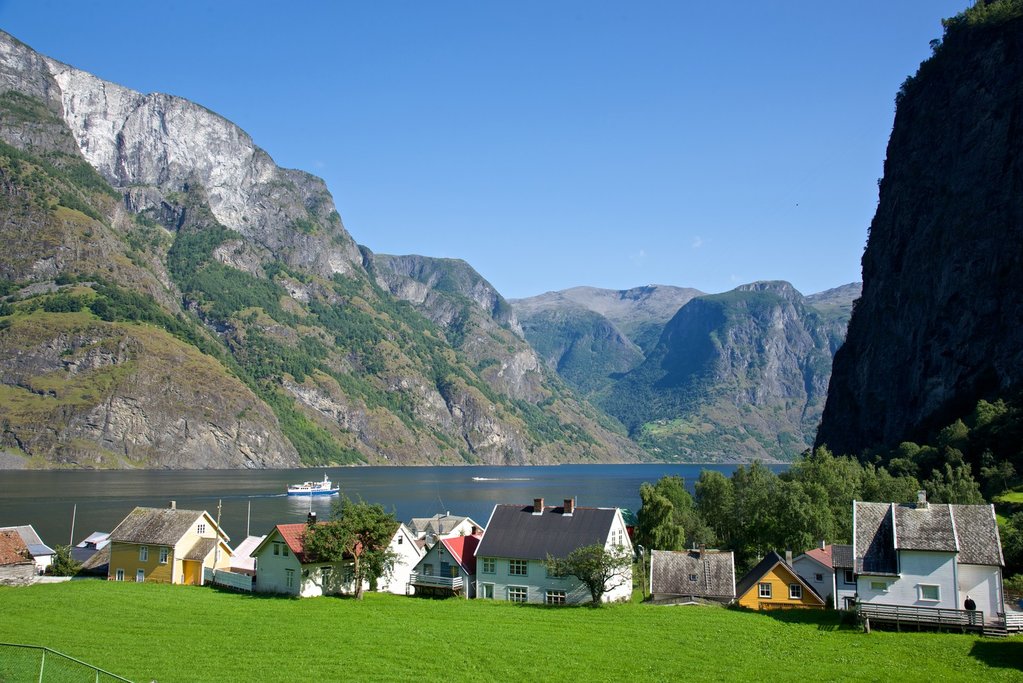 through wild and beautiful mountain scenery with waterfalls and steep mountain sides before reaching the fjord village of Flåm. Flåm is